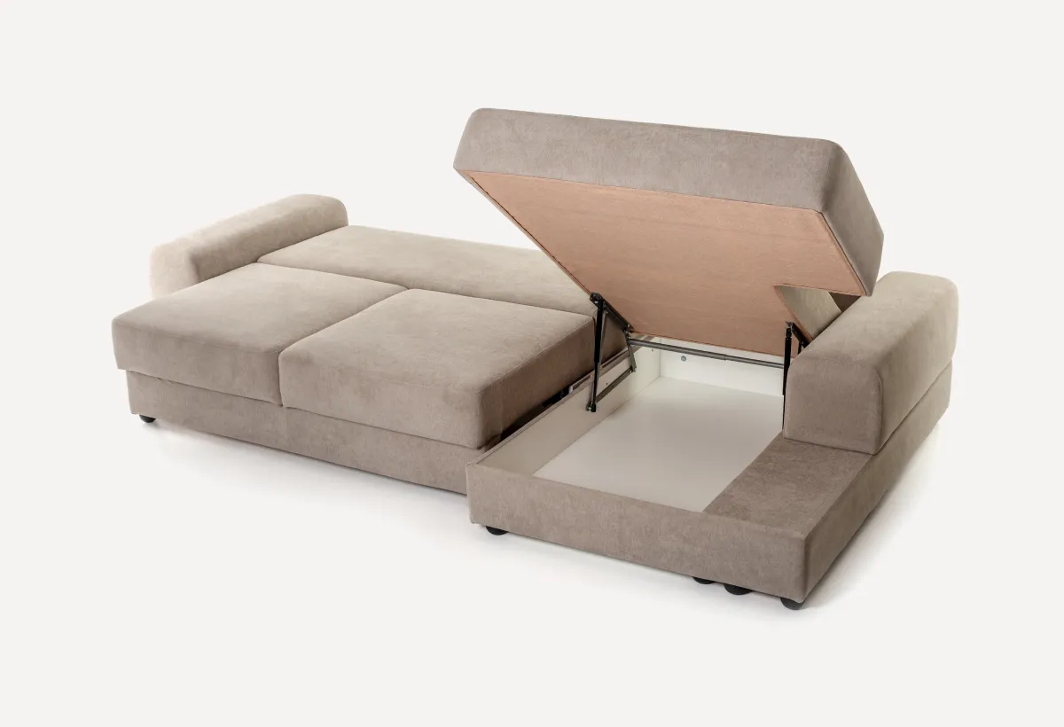 Диван с подлокотником (левый или правый)То же, что и средний диван, но с подлокотником с одной стороны. Внутри — механизм трансформации пантограф и ящик для белья. Можно использовать как отдельный диван для маленькой комнаты или как крайний модуль в большой конструкции.