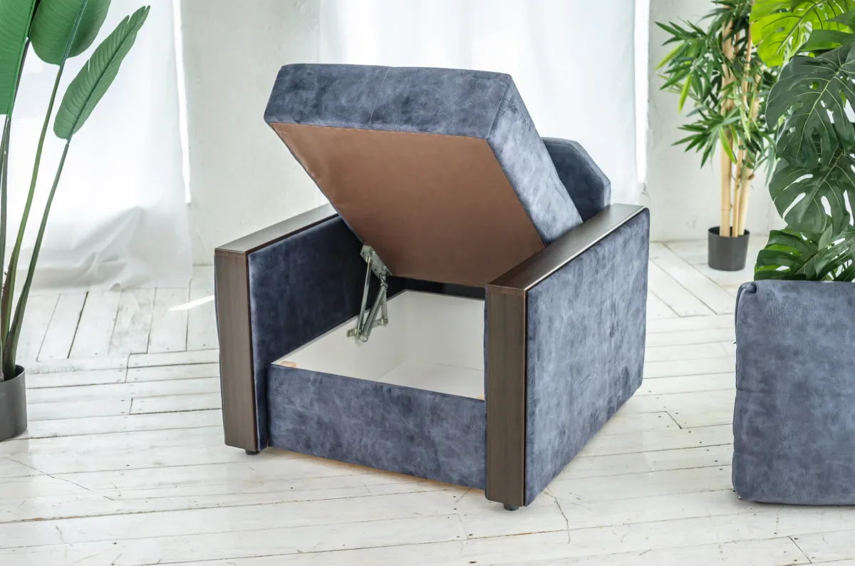 Кресло оснащено механизмом подъема, который позволяет откинуть сиденье и получить доступ к ящику для белья, что делает его не только удобным, но и функциональным. Кресло установлено на практически незаметные черные пластиковые опоры, что придает ему современный и стильный вид. Это кресло — идеальное сочетание стиля, комфорта и функциональности, которое украсит любое пространство и сделает его более уютным и практичным. Подушка также имеет трехслойный чехол с декоративной стежкой и утяжкой в центре. Наполнение подушки — поролоновая крошка, которая не слеживается со временем и хорошо восстанавливает форму после приложения нагрузки. -