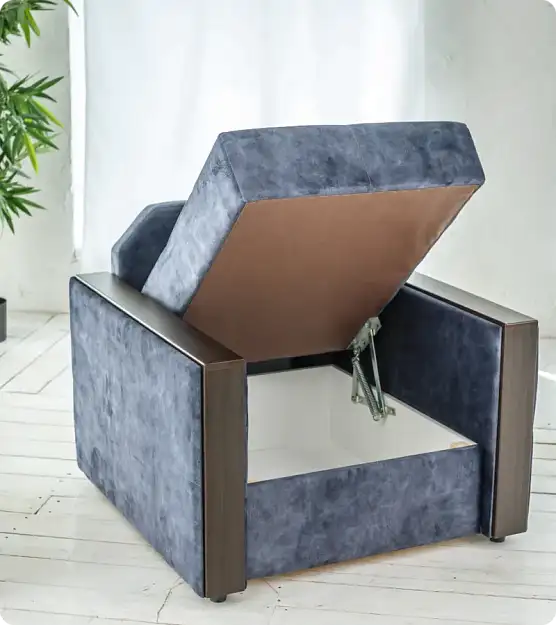 Дизайн и материалыКаркас кресла изготавливается из ДСП, брусков хвойных пород дерева и ДВП. Каркас ящика для хранения выполнен из ЛДСП белого цвета, а дно — из ДВП, окрашенного в белый цвет. Ящик оснащен воздуховодом, предотвращающим появление затхлого запаха. Основание сиденья состоит из листа ДСП, закрытого спанбондом для прочности. Для шумоизоляции используется слой термовойлока, на который устанавливается пружинный блок, закрытый слоями термовойлока, ППУ и синтепона. В основе спинки используется ДВП, оклеенное поролоном. Каркас кресла оклеивается поролоном и обтягивается трехслойным чехлом из файбертекса, синтепона и мебельной ткани, декорированным стежкой и утяжками. Подлокотники комплектуются накладками из МДФ, облицованными пленкой ПВХ в цветах венге или дуб сонома. МДФ — экологичный материал, устойчивый к влаге и простой в уходе. Достаточно протирать накладки влажной тканью, не используя абразивные чистящие средства.